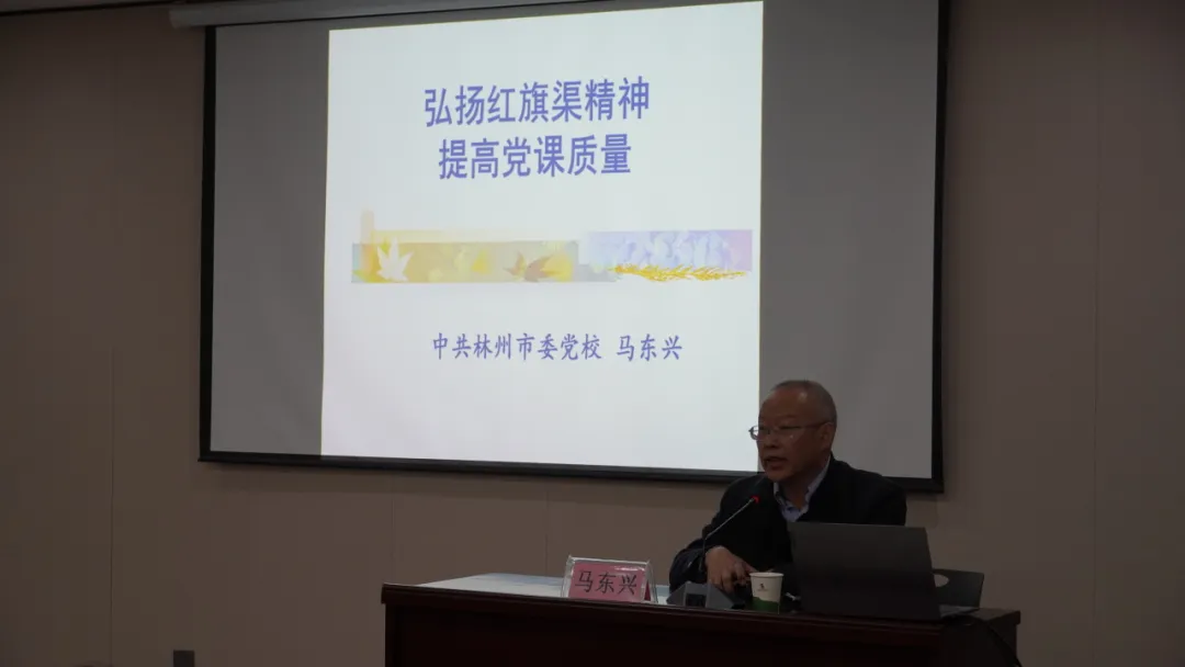随后中共林州市委党校的马东兴副校长面向学员开展了名为《弘扬红旗渠精神,提高党课质量》的党课教育,强调了各党支部要规范党内组织生活、严格“三会一课”制度,激活执行效能。要从实际出发,勇于自我批评、自我改正,并结合红旗渠的事迹进行详细讲解。