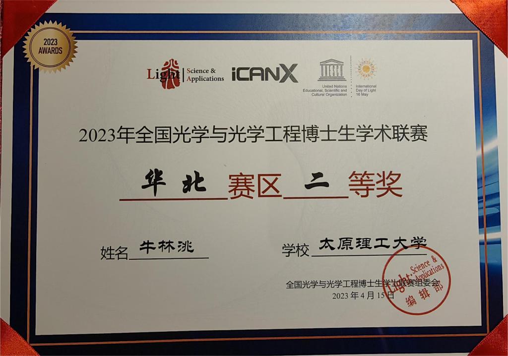 414-16日,新葡的京官网张明江教授指导的2022级光学工程博士生牛林洮同学在2023年全国光学与光学工程(华北赛区)博士生学术联赛荣获第三名、斩获二等奖。