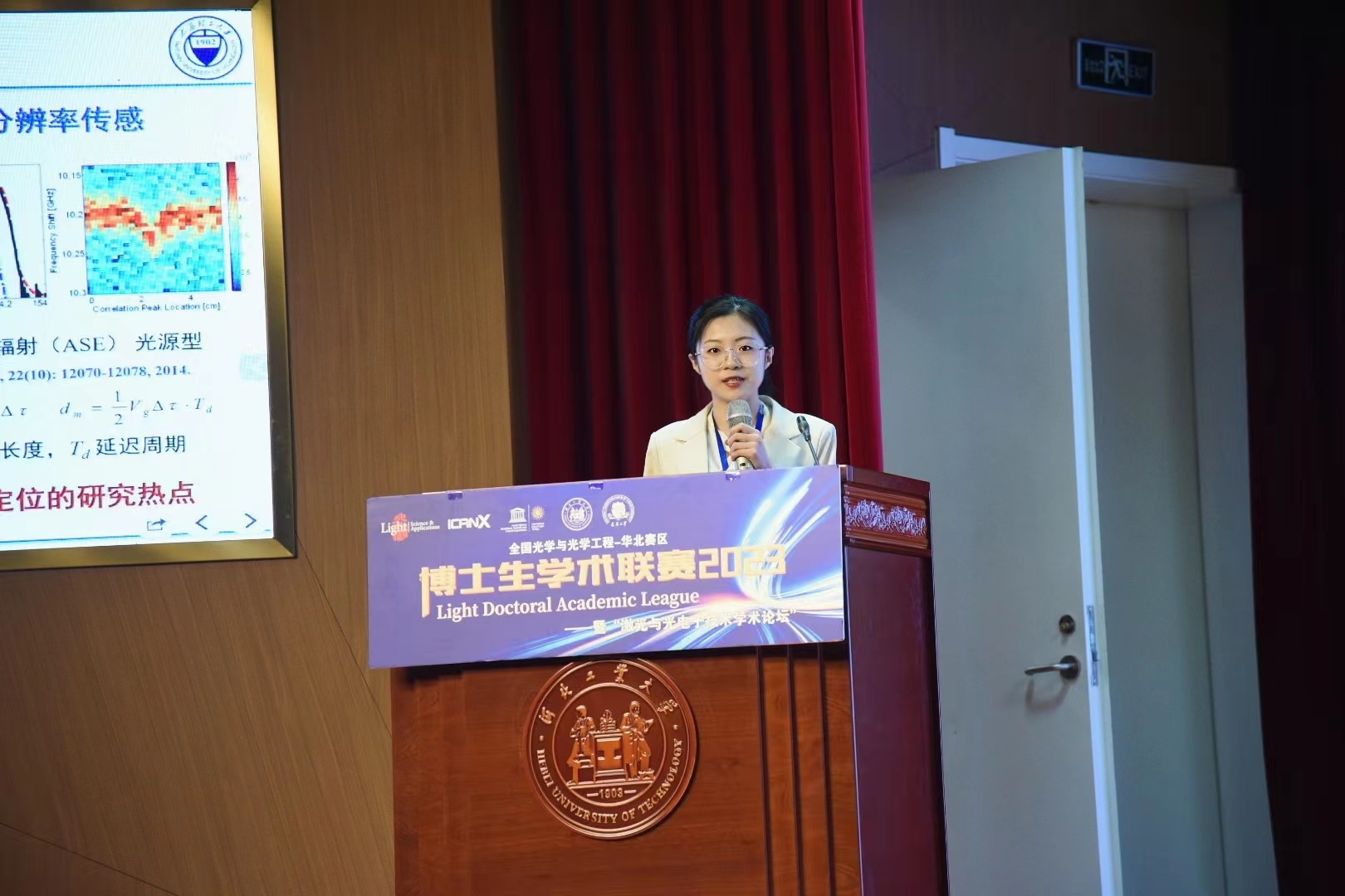 比赛全程采取PPT演示+问答的形式完成。赛会上牛林洮同学作了题为“高空间分辨率混沌布里渊光相关域分析技术”的学术报告,在导师张明江教授、青年教师王亚辉博士的悉心指导下,准备充分、答辩出色,得到29位评委专家的一致认可,最终获得华北赛区的二等奖(第三名),并将代表华北赛区参加全国百强积分赛。