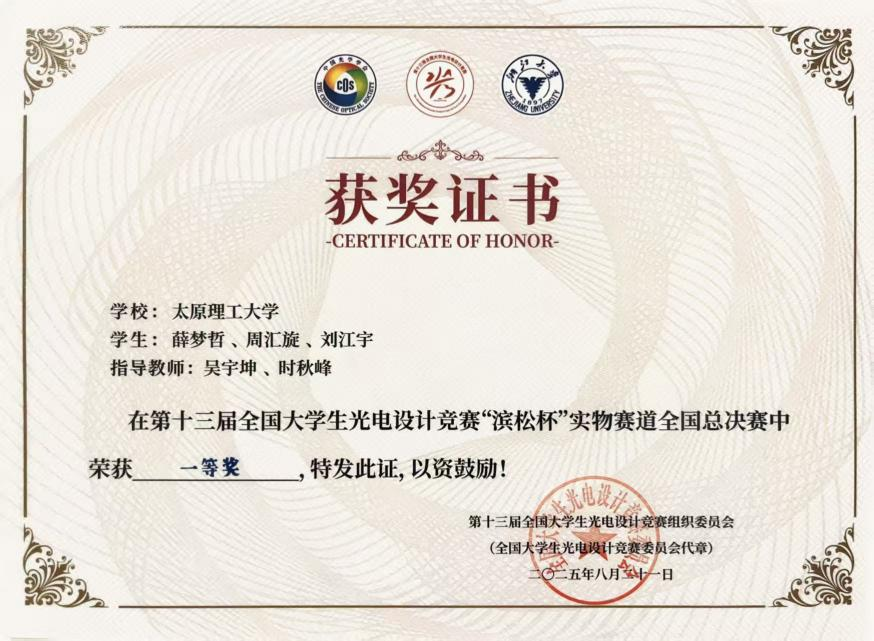 2025年8月22日,第十三届全国大学生光电设计竞赛决赛在浙江大学紫金港校区落下帷幕。来自新葡的京集团8814检测站的“越测越精”队——薛梦哲、刘江宇、周汇旋和团队指导老师——吴宇坤、时秋峰,凭借其出色的创新设计与稳定的临场发挥,从众多顶尖队伍中脱颖而出,一举夺得全国一等奖的骄人成绩。