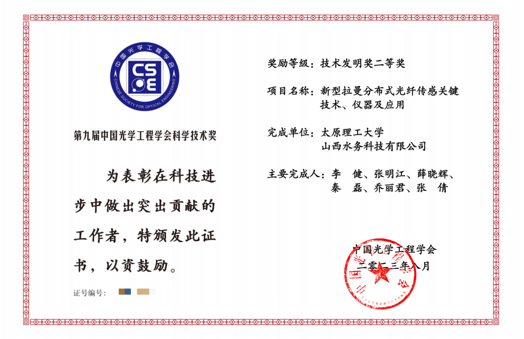 近日,第九届“中国光学工程学会科技创新奖”评选结果揭晓,太原理工大学物理学院张明江教授团队申报的“新型拉曼分布式光纤传感关键技术、仪器与应用”研究成果通过多轮严格评审,荣获“中国光学工程学会科技创新奖”技术发明二等奖(获奖人:李健、张明江、薛晓辉、秦磊、乔丽君、张倩)。